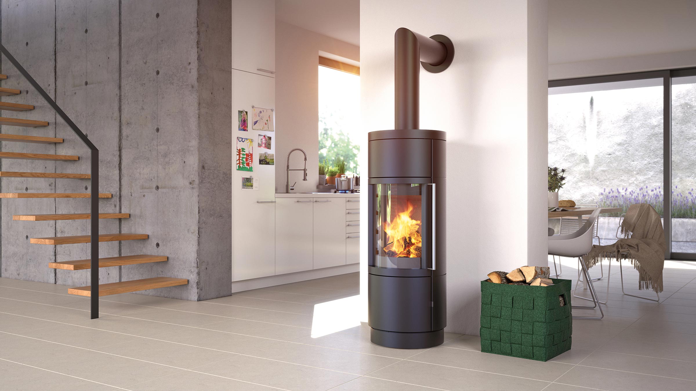 Offene Wohnbereiche. Drehbare Kaminöfen.